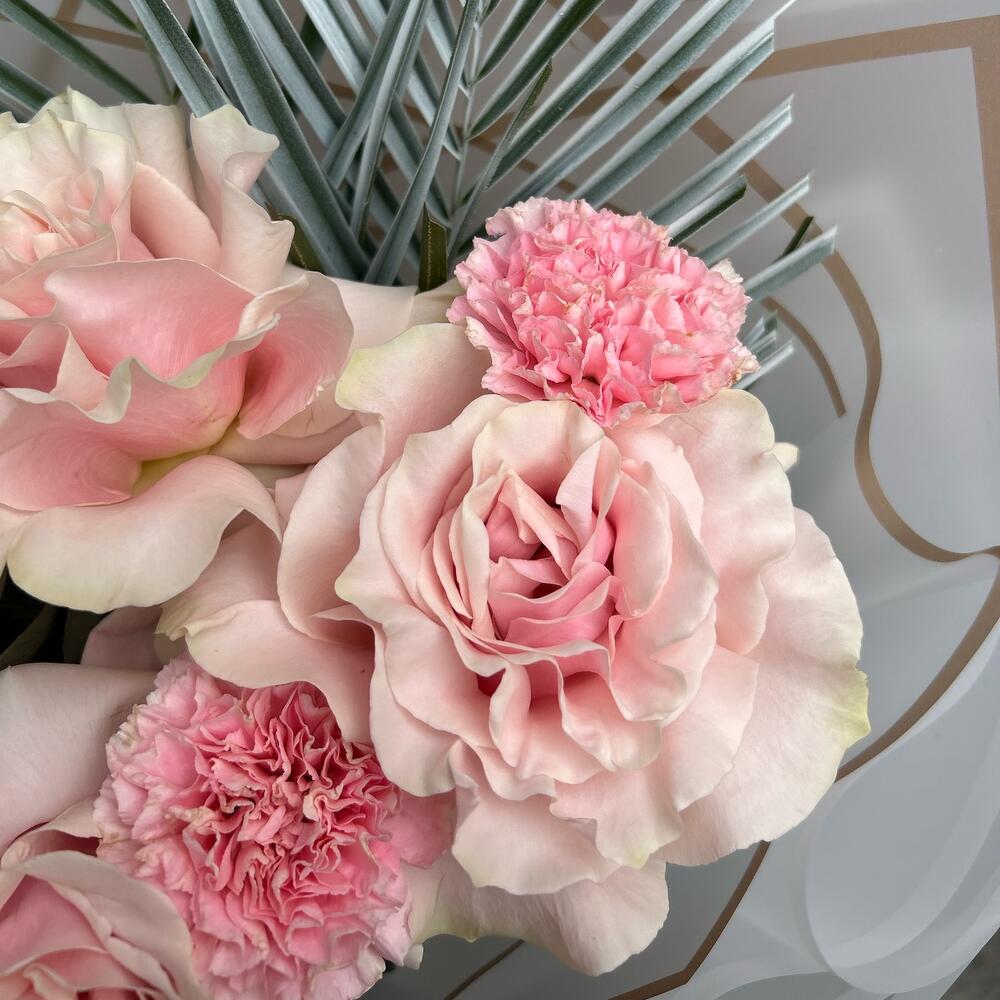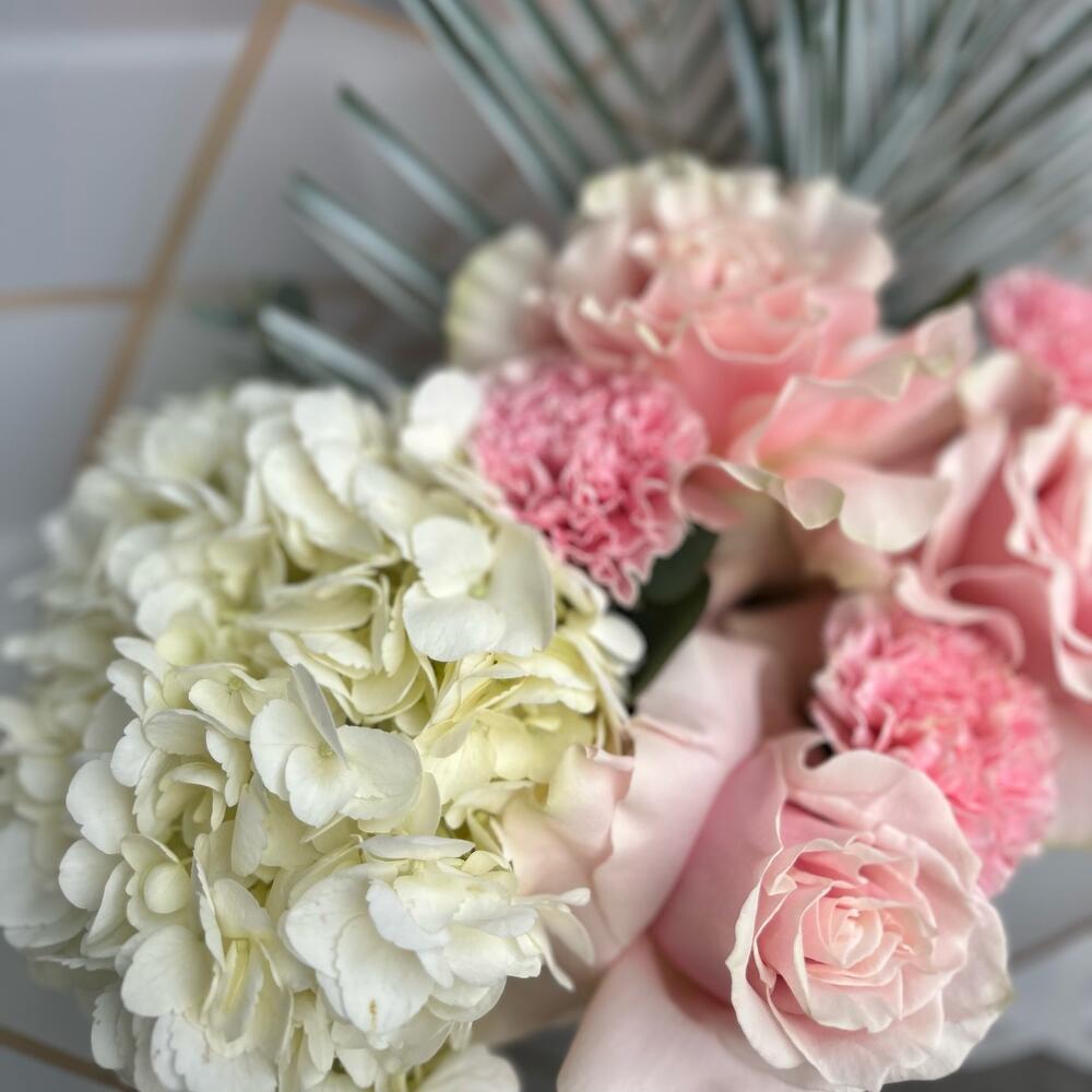 Гортензия – 1 шт.Роза Эквадор – 3 шт.Лента атласная – 2 шт.Диантус – 4 шт.Пальма – 2 шт.Упаковка дизайнерская – 5 шт.