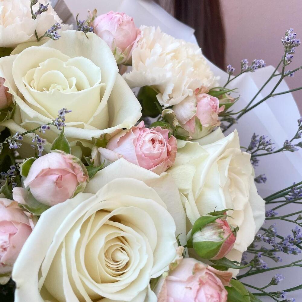 Роза белая – 5 шт.гвоздика brut – 3 шт.Роза кустовая bombastic – 2 шт.Лимониум синий – 2 шт.пальмовый лист – 1 шт.Упаковка – 1 шт.