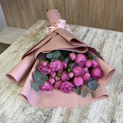 9 пионовидных роз сильва Пинк с эвкалиптом