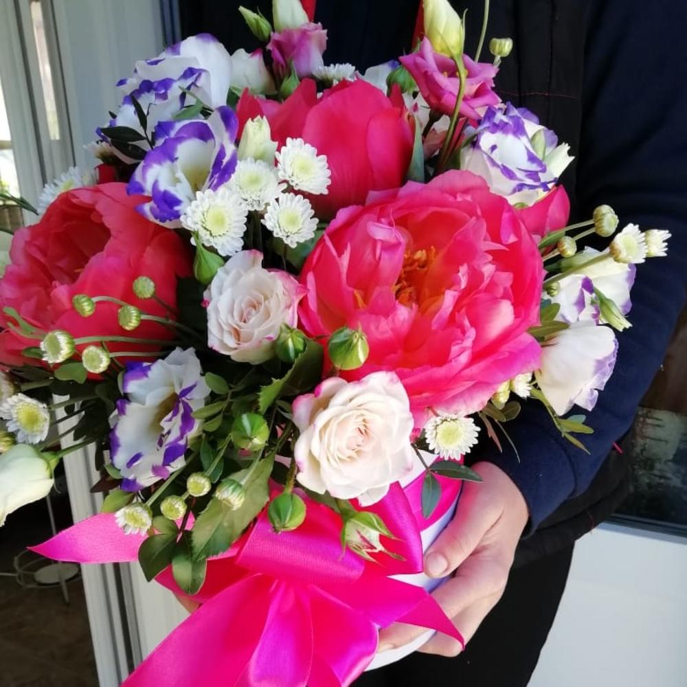 Лизиантус – 3 шт.Пион – 3 шт.Роза кустовая – 1 шт.Хризантема кустовая – 1 шт.Зелень – 1 шт.Лента атласная – 1 шт.Коробка шляпная – 1 шт.Оазис – 1 шт.