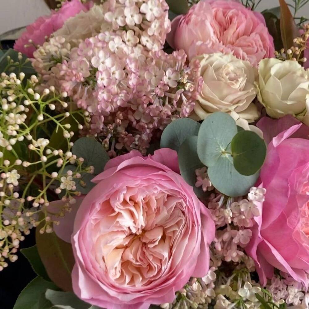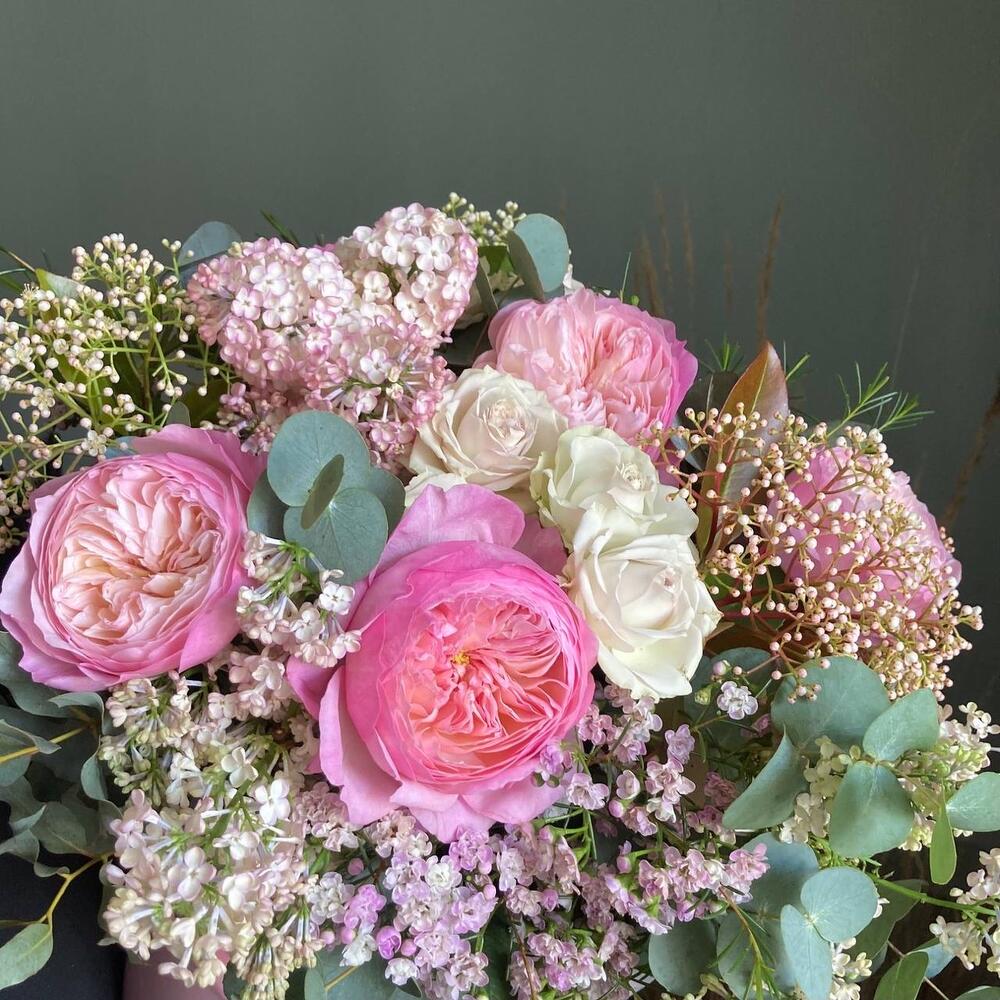 Роза пионовидная – 7 шт.Роза кустовая пионовидная – 3 шт.Сирень – 3 шт.фотиния – 2 шт.Ваксфлауэр – 2 шт.Эвкалипт – 6 шт.Оазис флористический – 2 шт.Шляпная коробка – 1 шт.