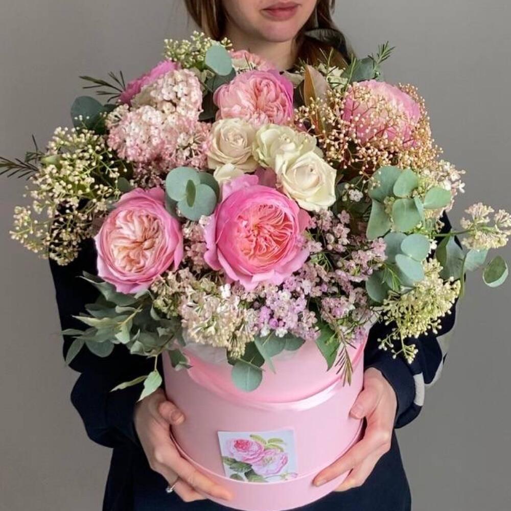 Садовая композиция в шляпной коробке с пионовидными розами, сиренью, ваксфлауэром, фатинией и эвкалиптом.