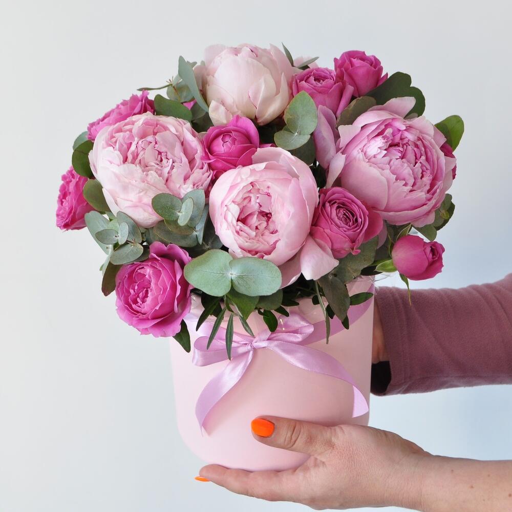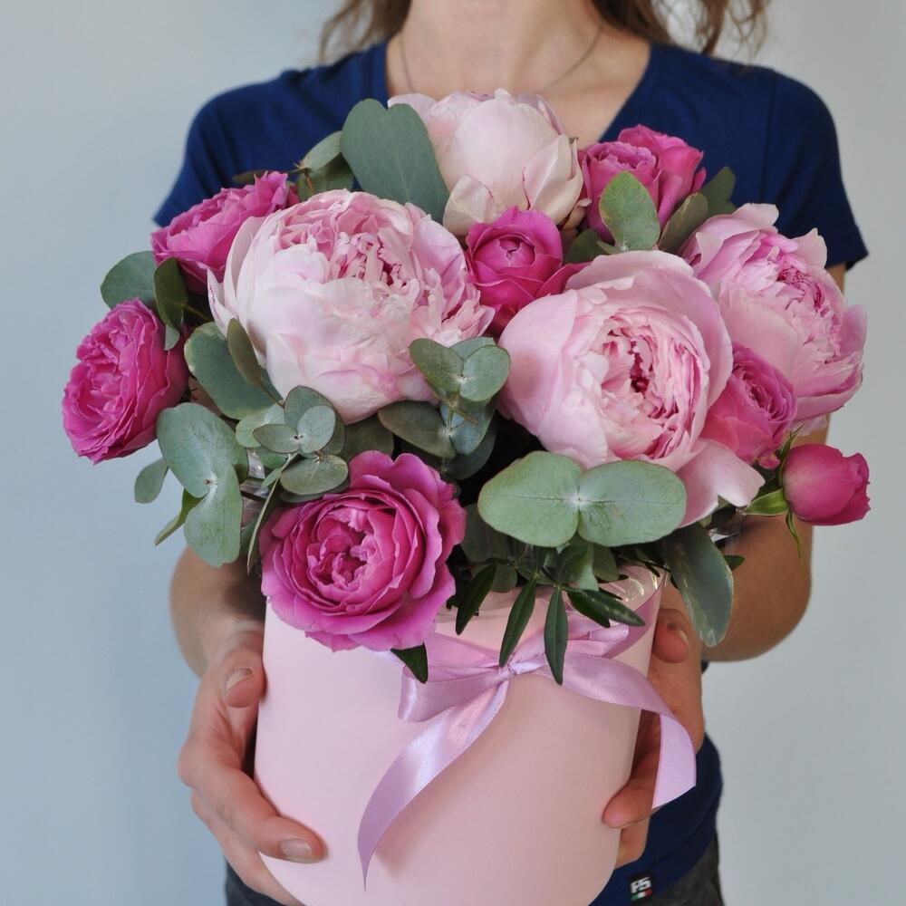 Эвкалипт – 5 шт.Лента атласная – 1 шт.Коробка шляпная – 1 шт.Роза кустовая пионовидная – 4 шт.Оазис флористический – 1 шт.пион розовый ароматный – 7 шт.