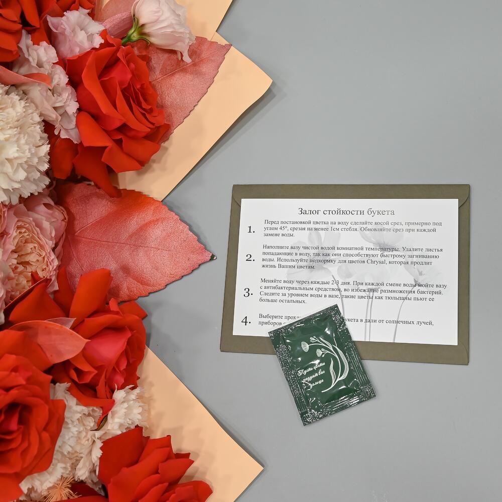 Яркий букет в красно персиковой цветовой гамме. В составе французские розы, пионовидная кустовая роза, гвоздика и лизиантус.Флористы студии Цветочный Этикет собрали его из самых свежих цветов, тщательно продумав состав. Букет готов удивлять красотой своего получателя! … Показать ещёСтанет идеальным подарком для любимой женщины, дочке или мамы, на День Рождения, юбилей, свадьбу и другие торжественные мероприятия. С букетом вы получите конверт с открыткой, в которой мы напишем любое пожелание, инструкцию свежести и средство для продления жизни срезанных цветов.