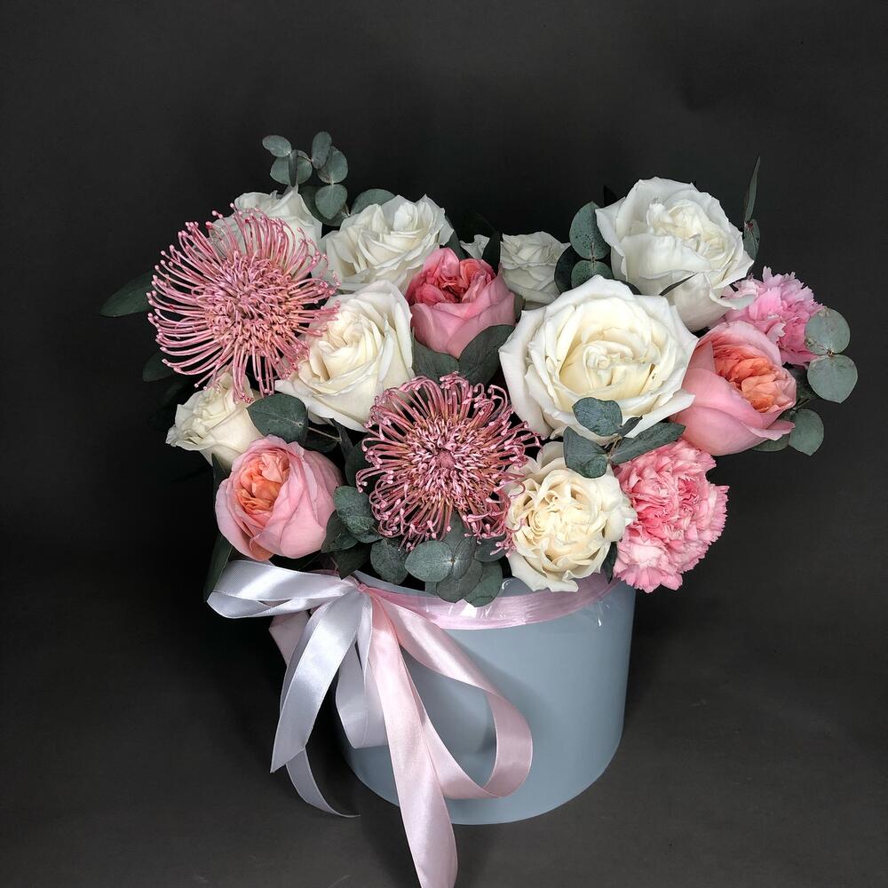 Роза пионовидная – 11 шт.Эвкалипт – 4 шт.Диантус – 3 шт.леукоспермум розовый – 2 шт.Оазис флористический – 2 шт.Коробка – 1 шт.Лента атласная – 3 шт.