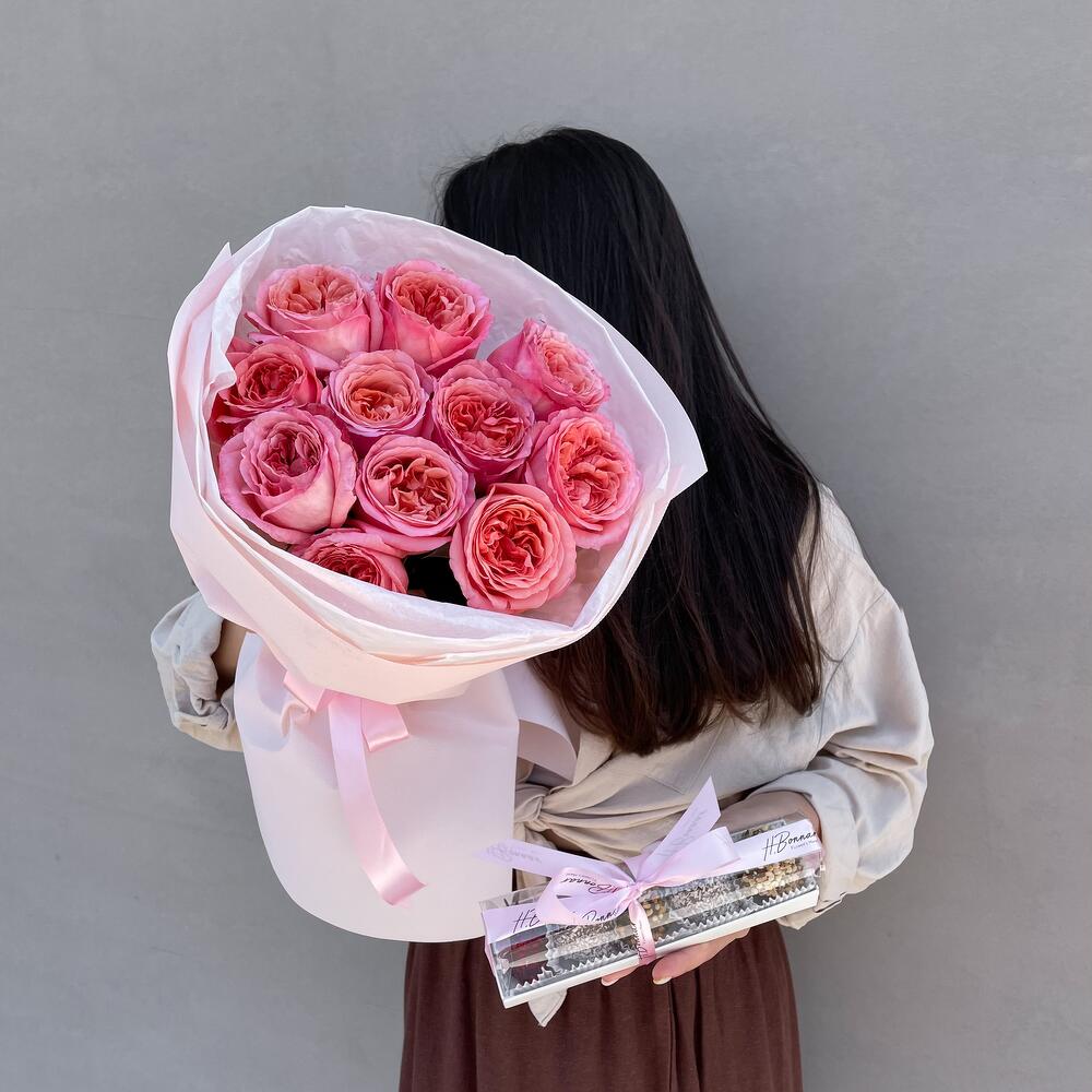 Букет из сортовых садовых роз и коробка клубники в бельгийском шоколаде.