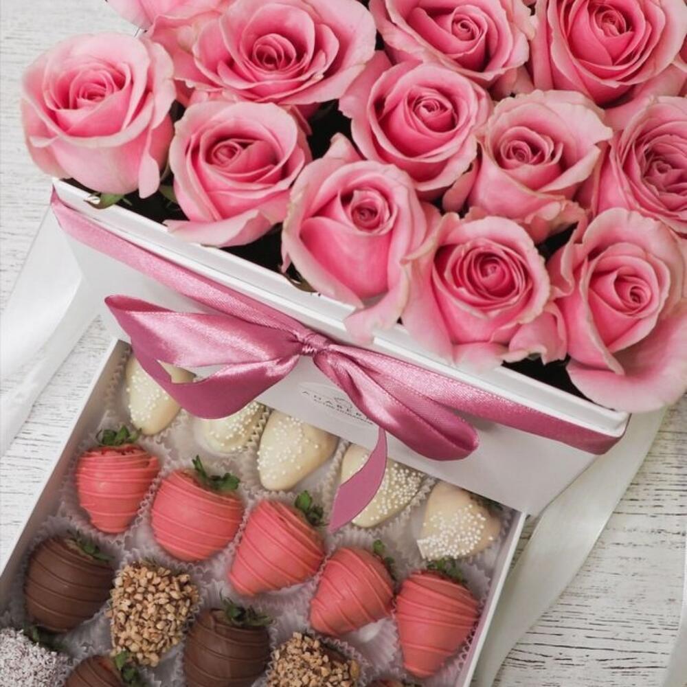 -25 розовых роз-клубника в бельгийском молочном, белом и розовом шоколаде 20 шт (кондитерские посыпки, кокосовая стружка, ореховая стружка) размер коробки 20*20*20 см