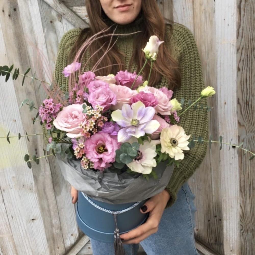 Маттиола – 3 шт.Роза – 7 шт.Лизиантус – 3 шт.Ваксфлауэр – 3 шт.Эвкалипт – 5 шт.Ковыль – 2 шт.Шляпная коробка – 1 шт.Тишью – 2 шт.Оазис – 1 шт.Анемон – 3 шт.
