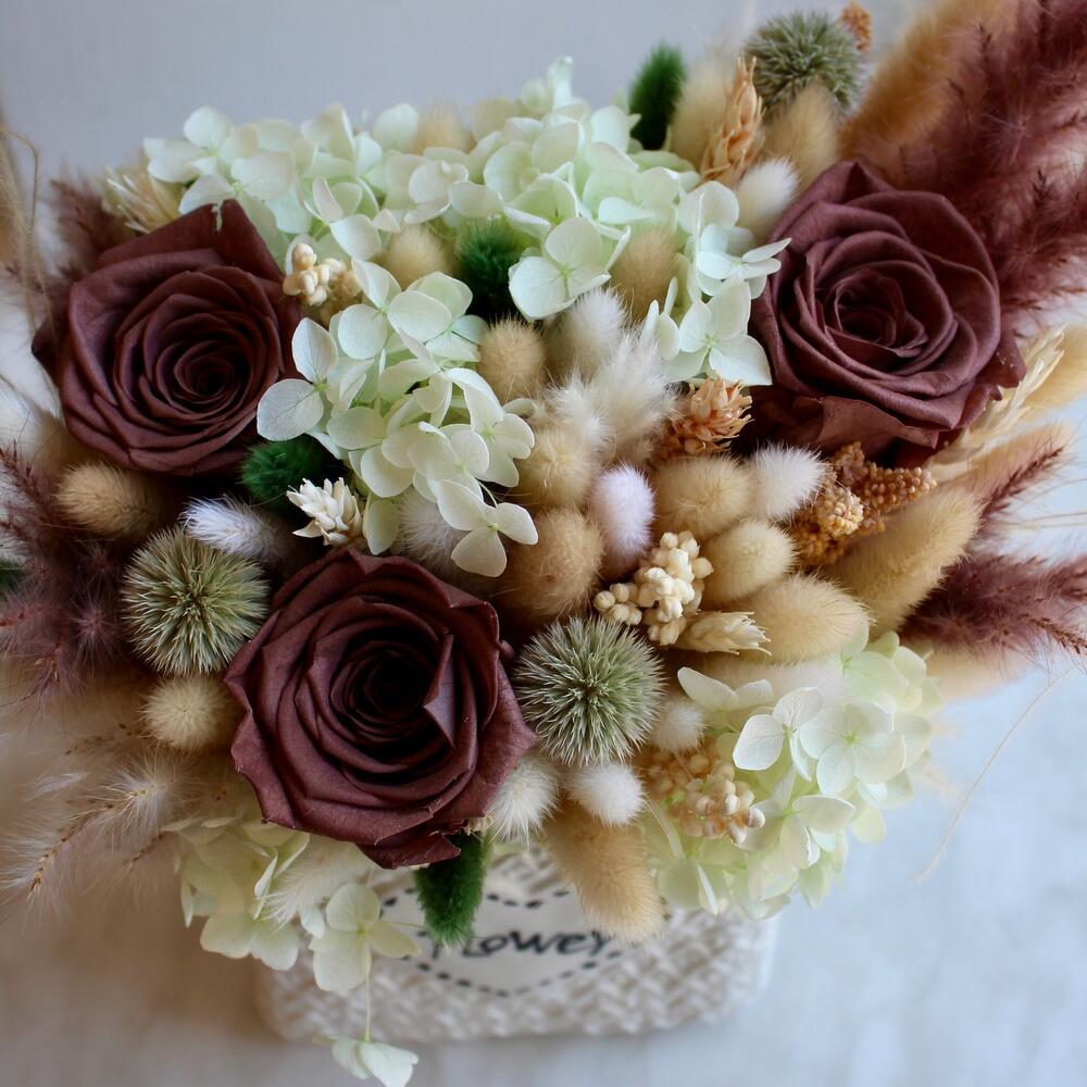 Роза одноголовая – 3 шт.Гортензия – 1 шт.пушистики – 1 шт.Колосья – 1 шт.Керамическое кашпо – 1 шт.