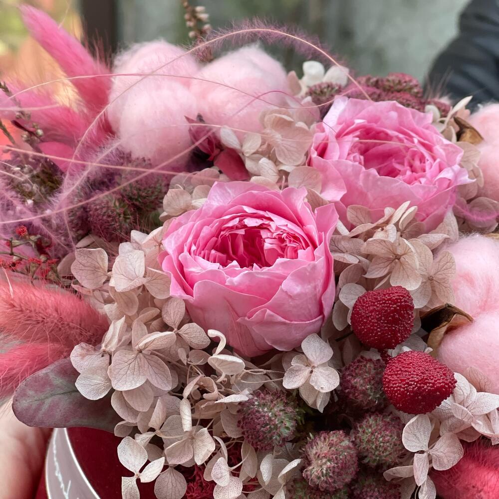 Коробка шляпная бархатная – 1 шт.Роза стабилизированная – 2 шт.Хлопок – 3 шт.гортензия стабилизированная – 1 шт.Лагурус (сухоцвет) – 25 шт.Эвкалипт стабилизированный – 4 шт.Ковыль – 8 шт.Мох стабилизированный – 10 шт.Бруния – 2 шт.Оазис флористический – 1 шт.цветы микс – 15 шт.Лента атласная – 2 шт.