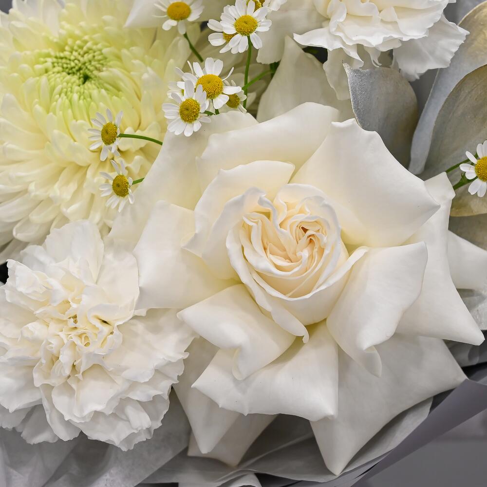 Стильный букет в бело-голубой цветовой гамме. В составе французские розы, сортовая гвоздика, тюльпаны, кустовая ромашка и пышная одноголовая хризантема.Флористы студии Цветочный Этикет собрали его из самых свежих цветов, тщательно продумав состав. Букет готов удивлять … Показать ещёкрасотой своего получателя! Станет идеальным подарком для любимой женщины, дочке или мамы, на День Рождения, юбилей, свадьбу и другие торжественные мероприятия. С букетом вы получите конверт с открыткой, в которой мы напишем любое пожелание, инструкцию свежести и средство для продления жизни срезанных цветов.