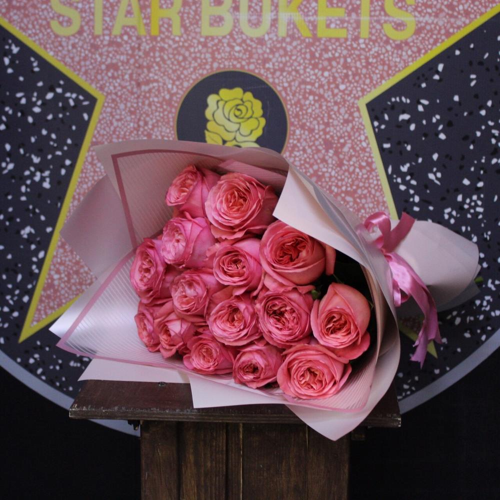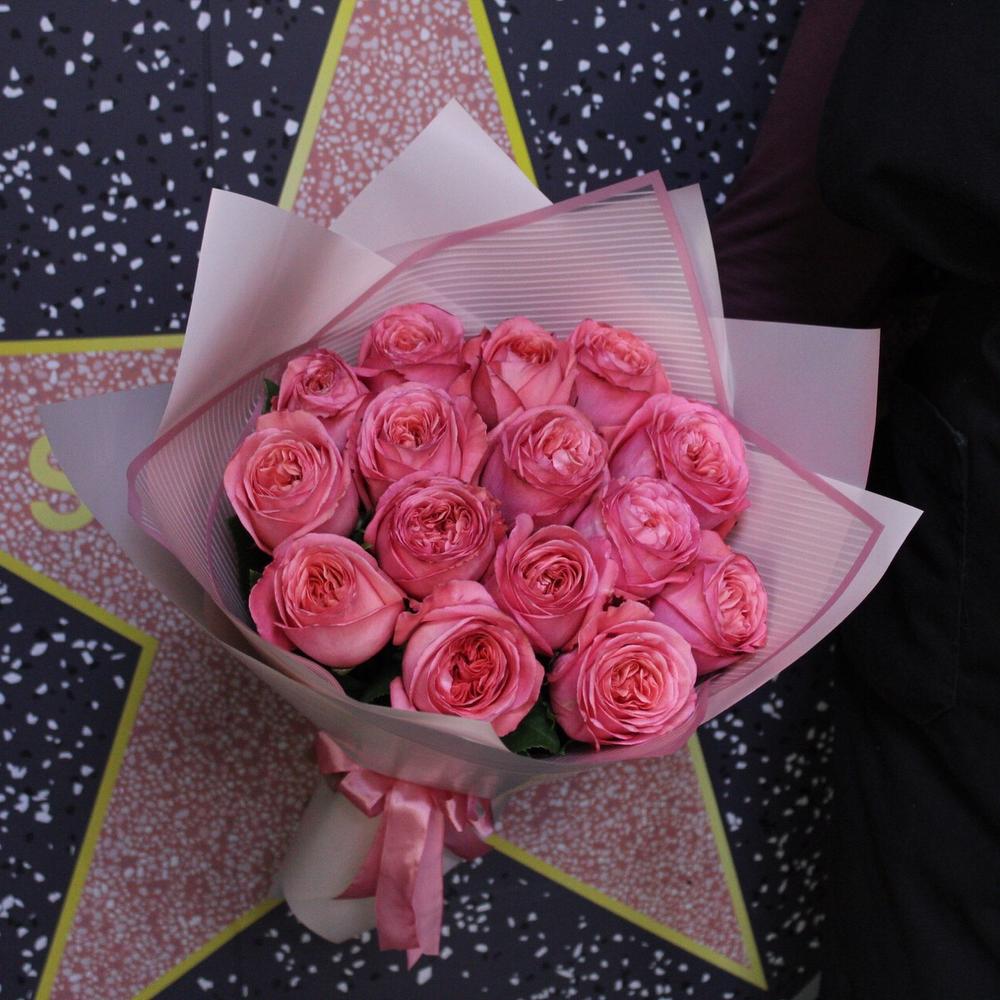роза пионовидная пинк экспрешн – 15 шт.Пленка дизайнерская – 3 шт.Лента атласная – 2 шт.