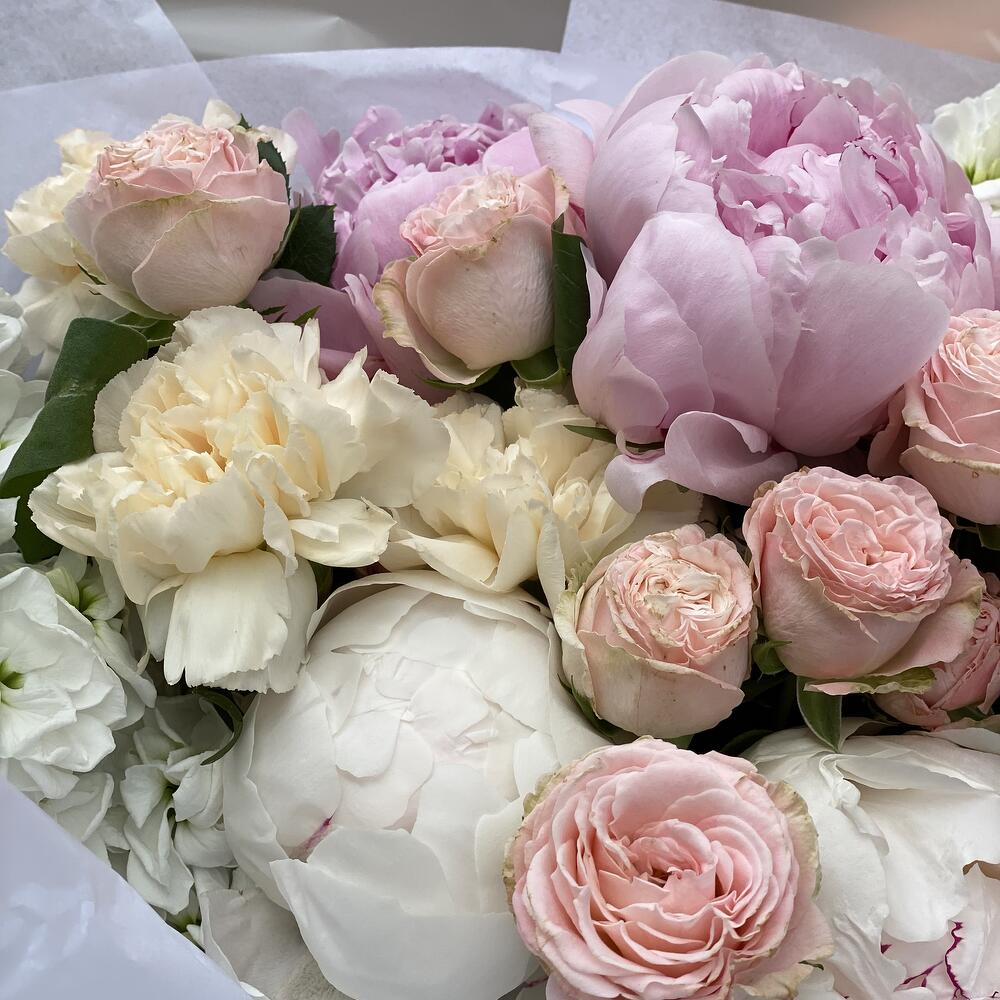 Потрясающий букет из идеального состава: крупные пионы, ароматная маттиола, кустовая пионовидная роза! Букет одновременно нежный и торжественный!