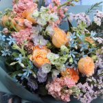 Авторский букет с пионовидными розами, маттиолой, ваксфлауэром и твидией.