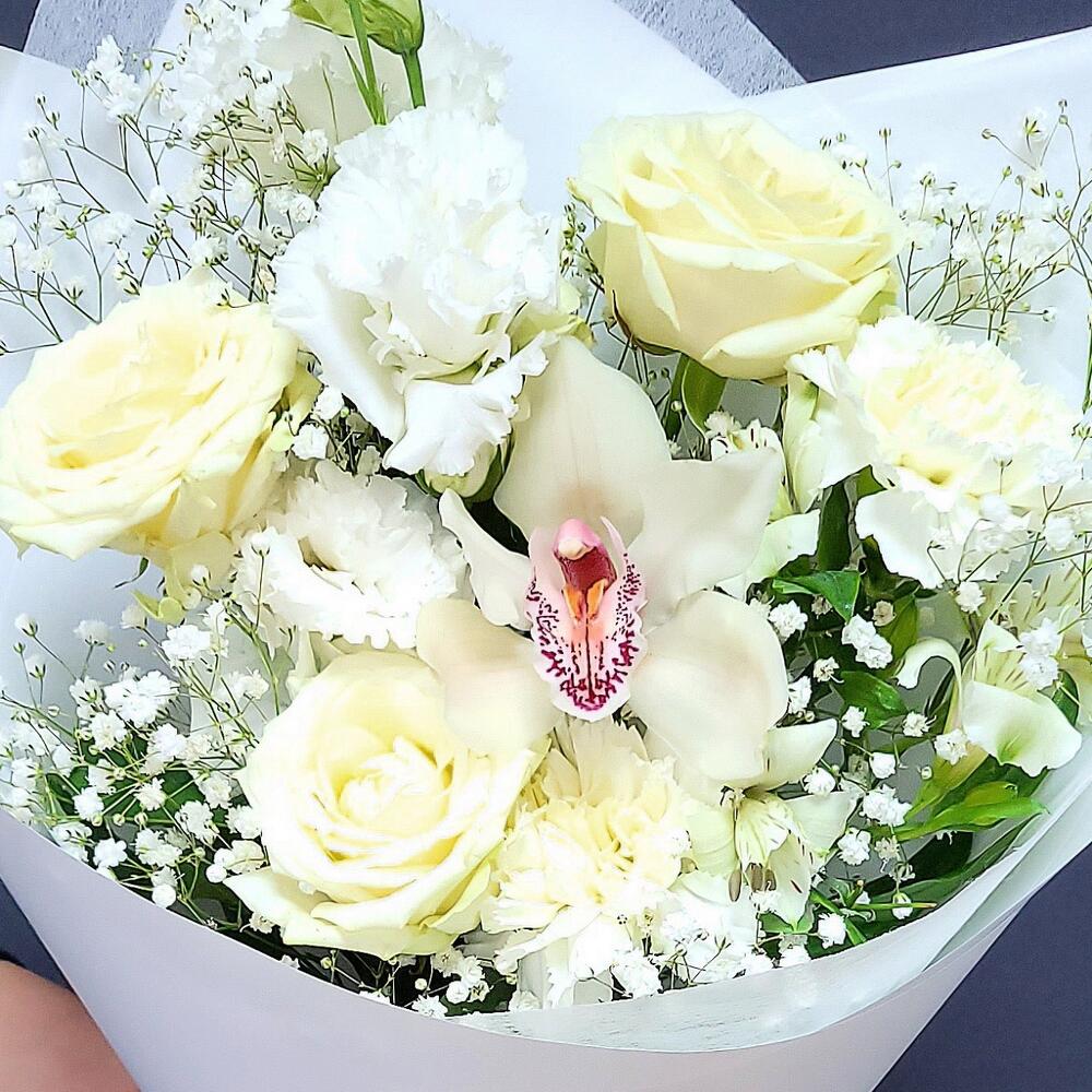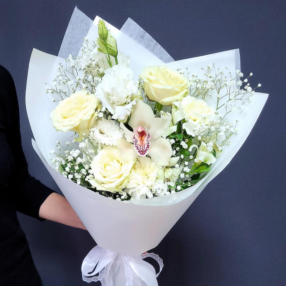 Альстромерия – 1 шт.Гипсофила – 1 шт.Лизиантус – 1 шт.Орхидея Цимбидиум – 1 шт.Роза кустовая – 1 шт.Роза – 3 шт.Гвоздика – 2 шт.Упаковка дизайнерская – 1 шт.