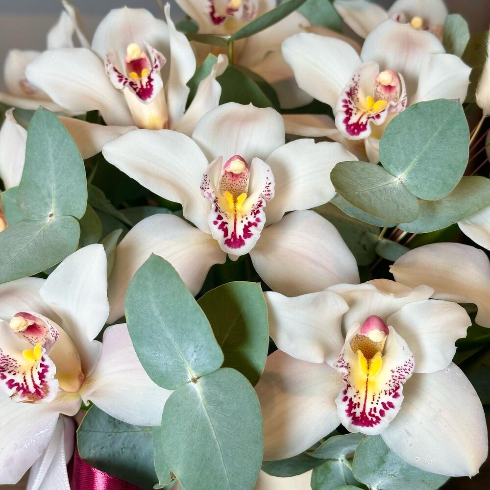 Орхидея Цимбидиум – 11 шт.Эвкалипт – 5 шт.Лагурус – 5 шт.Коробка шляпная – 1 шт.Оазис флористический – 1 шт.Лента атласная – 2 шт.