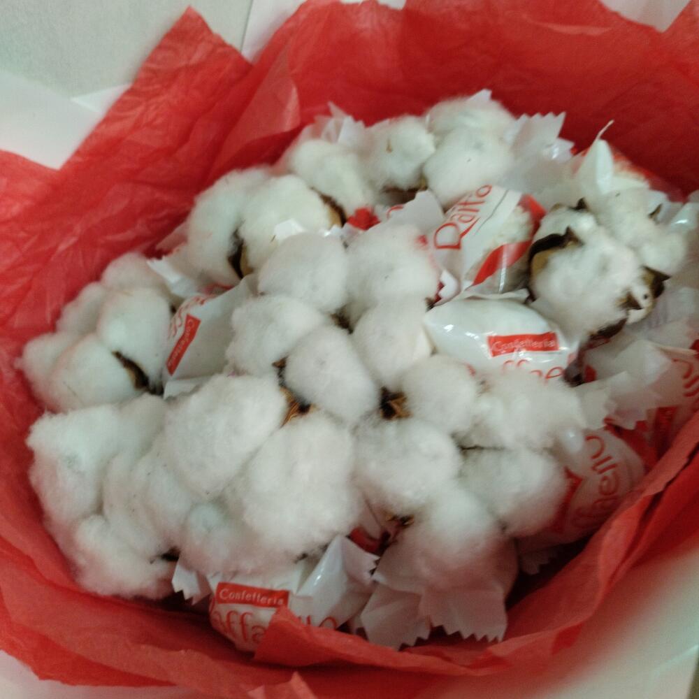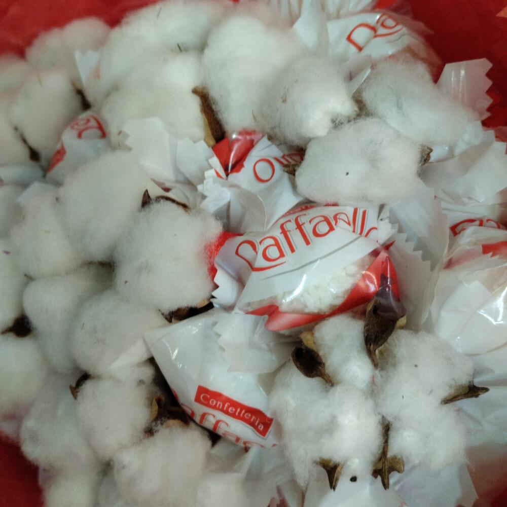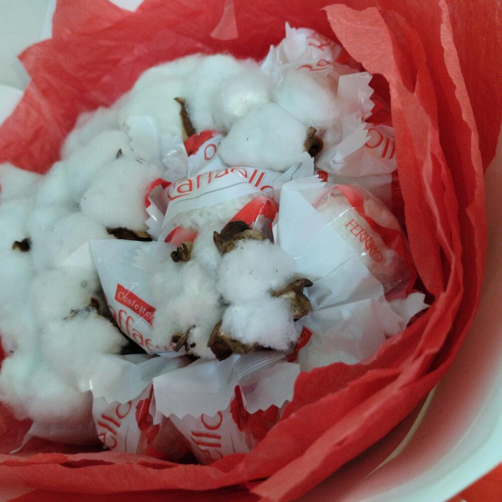 Raffaello конфеты – 19 шт.Хлопок – 8 шт.Тишью – 1 шт.бумага дизайнерская – 1 шт.Лента атласная – 1 шт.