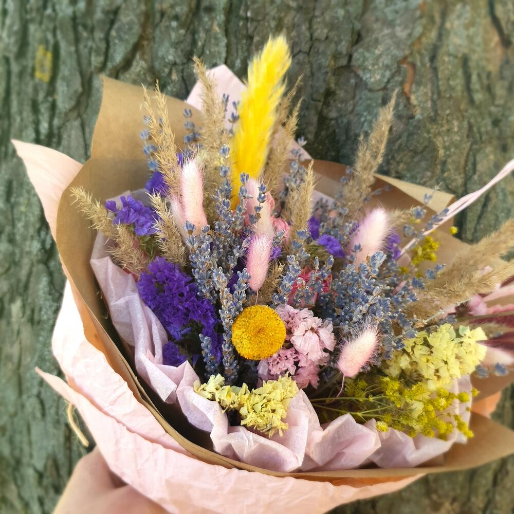 Колоски – 11 шт.Крафт упаковка – 2 шт.Лаванда (сухоцвет) пучок – 1 шт.Шпагат джутовый – 1 шт.гипсофила сухоцвет ветка – 1 шт.лагурус (сухоцвет) розовый – 7 шт.статица синяя сухоцвет – 3 шт.статица желтая сухоцвет – 2 шт.розы сухоцвет микс – 3 шт.краспедия желтая сухоцвет – 2 шт.статица розовая сухоцвет – 1 шт.