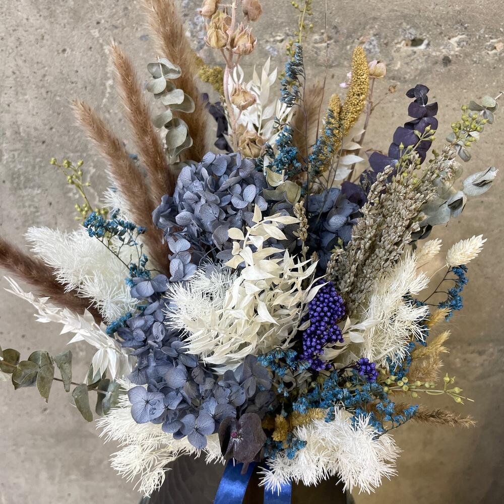Ваза стекло – 1 шт.гортензия сухоцвет – 1 шт.Эвкалипт сухоцвет – 10 шт.рускус сухоцвет – 5 шт.аспарагус сухоцвет – 5 шт.лимониум сухоцвет – 5 шт.Лаванда пучок – 1 шт.озотамнус сухоцвет – 2 шт.сеттария – 5 шт.Ковыль – 1 шт.Лента атласная – 1 шт.