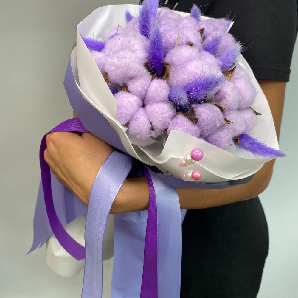 Легкий хлопок и лагурус отлично подходят для подарка любимым людям. Такой букет не завянет и будет долго радовать вас свей красотой.Уважаемые посетители! Пожалуйста обратите ваше внимание на размер букета при заказе! Он учитывается вместе с упаковкой