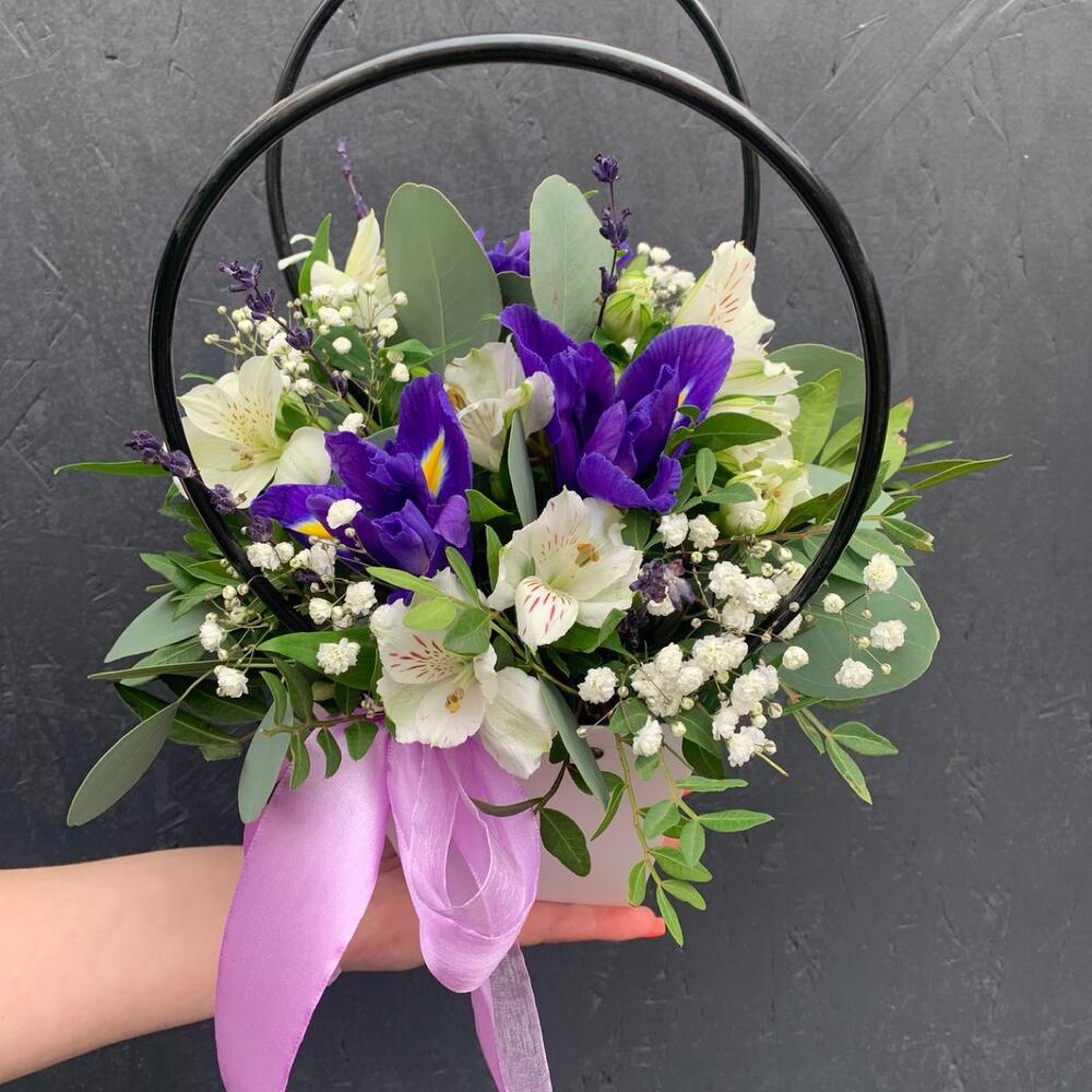Ирисы с альстромериями, гипсофилой и лавандой с зеленью в сумочке