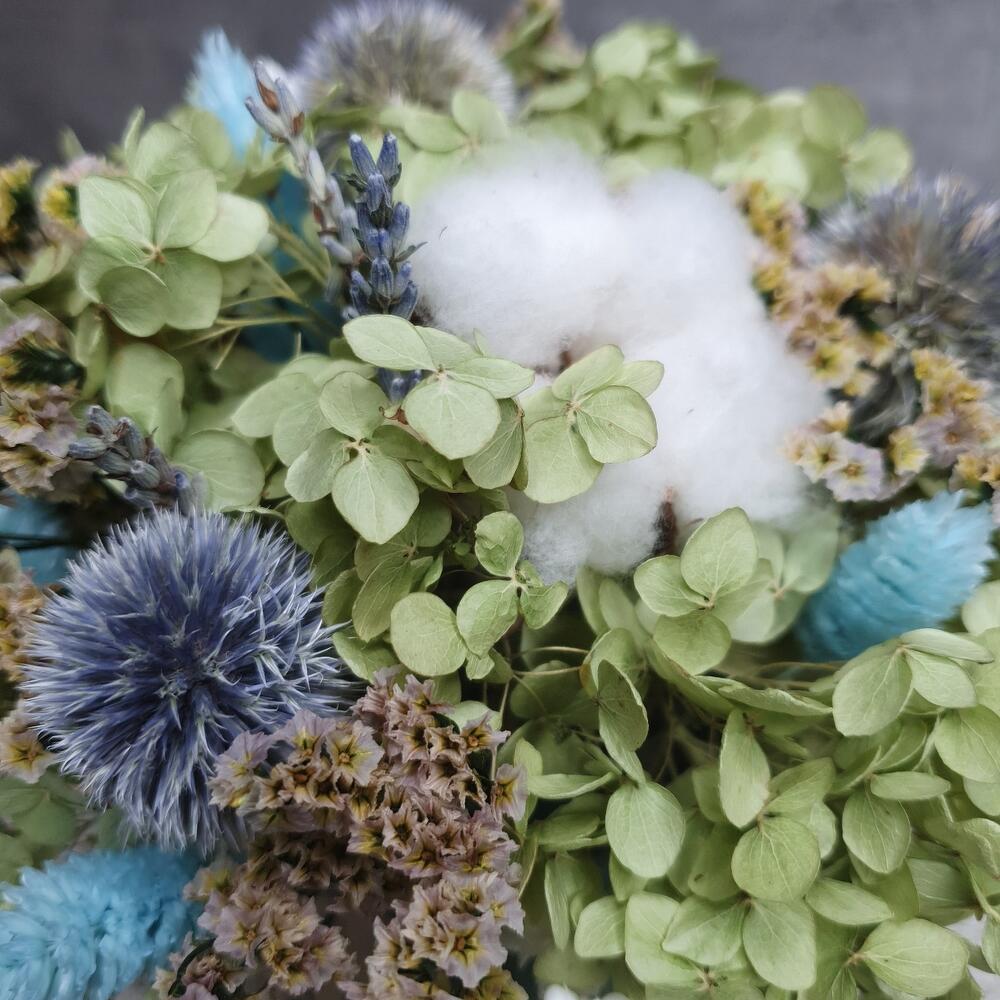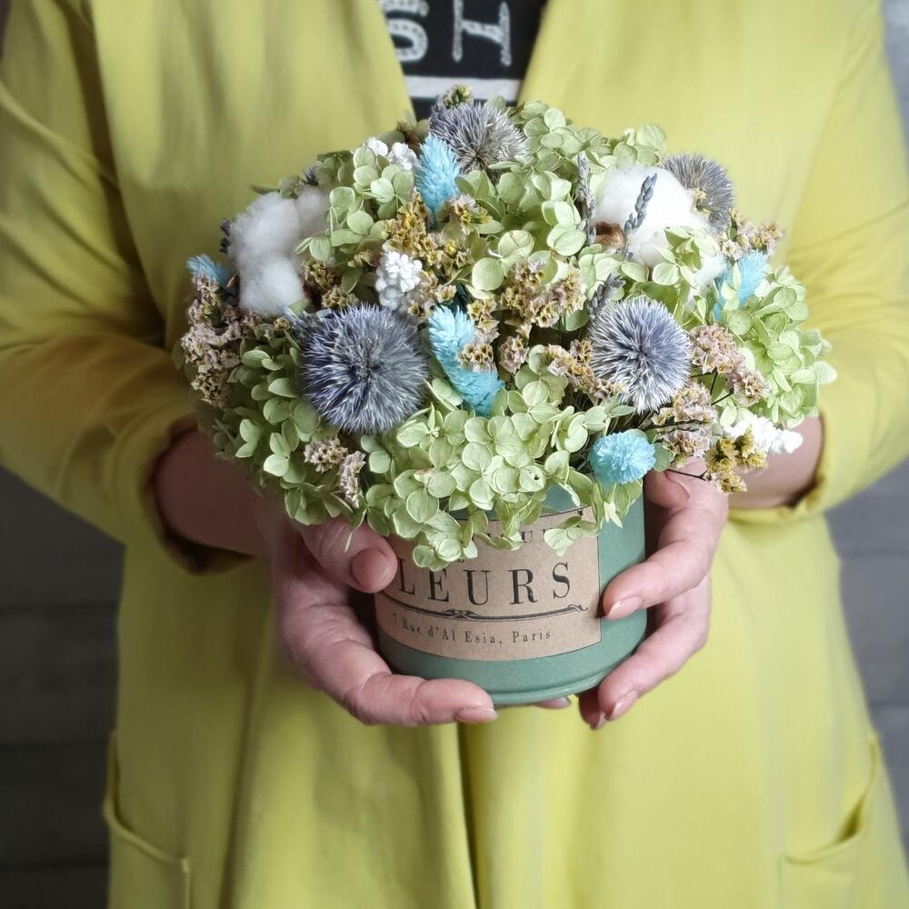 Эхинопс – 5 шт.гортензия сухоцвет – 1 шт.Фаларис – 7 шт.Хлопок натуральный – 3 шт.сорго пучок – 1 шт.стабилизированная статица пучок – 1 шт.лавандин пучок – 1 шт.Кашпо металлическое – 1 шт.