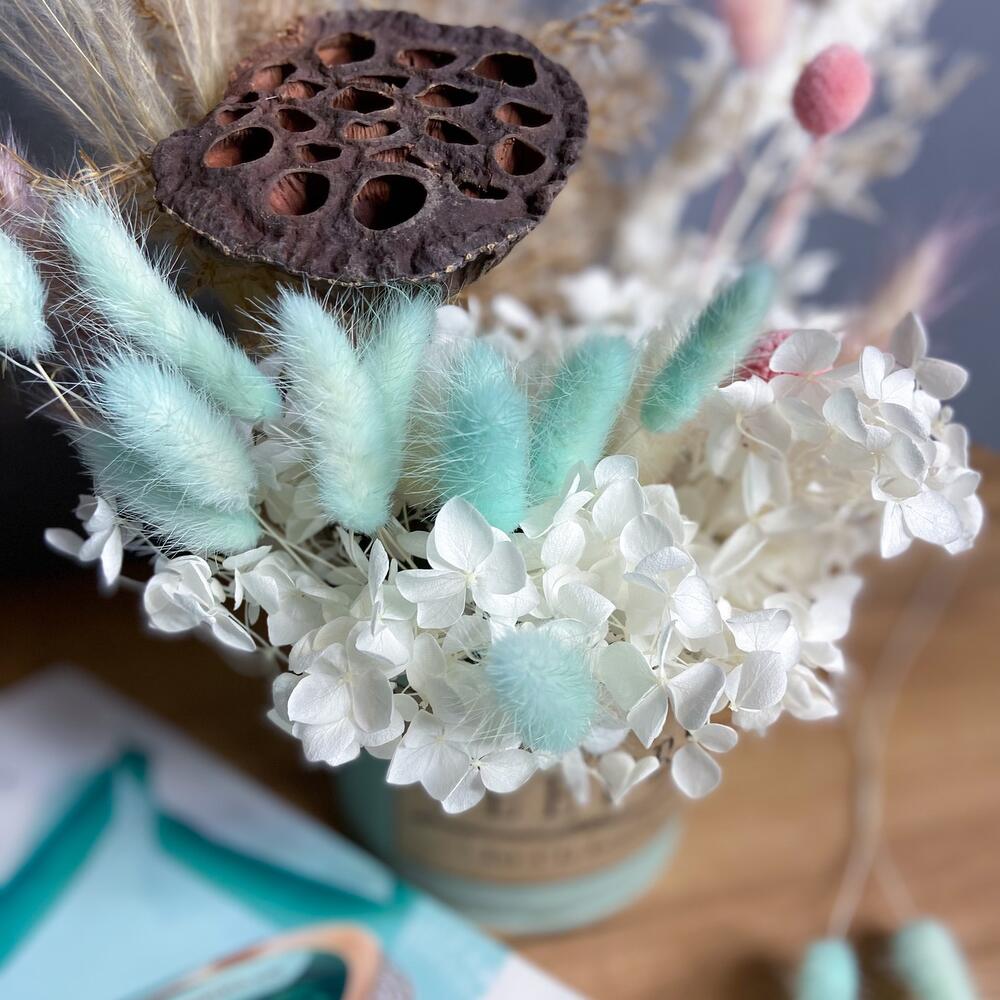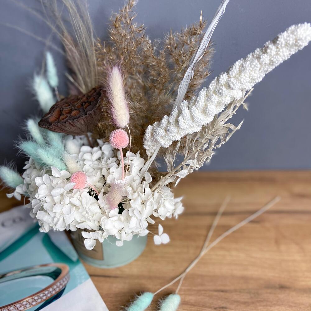 гортензия белая стабилизированная – 1 шт.Лотос (коробочка) – 1 шт.ковыль (пучок) – 1 шт.сетария сухоцвет – 1 шт.иглица – 1 шт.краспедия розовая – 2 шт.Лагурус (сухоцвет) – 16 шт.камыш крашенный – 1 шт.пампасная трава – 1 шт.банка жестяная – 1 шт.
