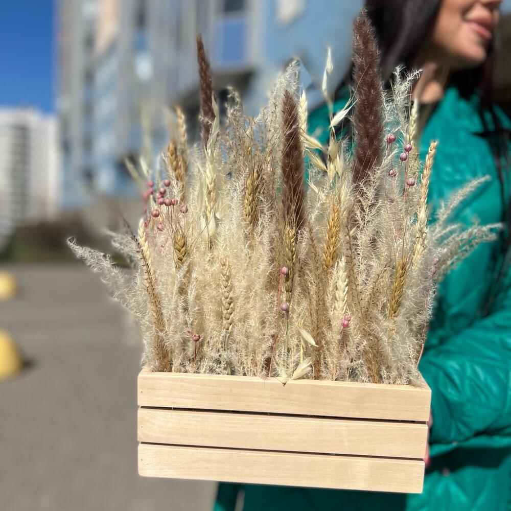 Оазис – 1 шт.Пшеница – 25 шт.Лен – 3 шт.Кашпо деревянное – 1 шт.овес сухоцвет – 3 шт.кортадерия – 3 шт.кортадерия ( бежевая ) – 5 шт.мискантус – 1 шт.