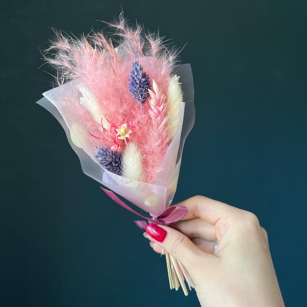 пампас – 1 шт.Лагурус (сухоцвет) – 3 шт.фаларис сухоцвет – 3 шт.Нигелла сухоцвет – 2 шт.