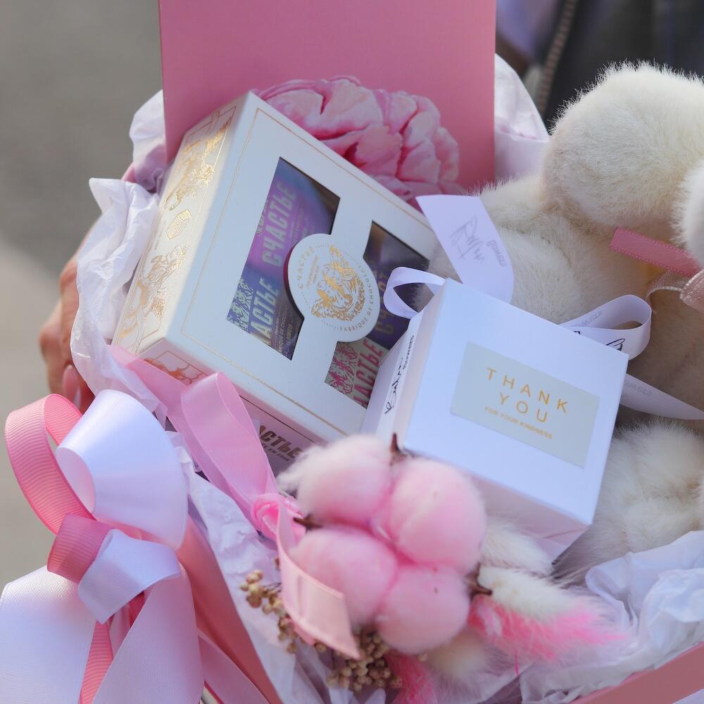 Подарочный набор с розовым медведем, сладостями и сухоцветами