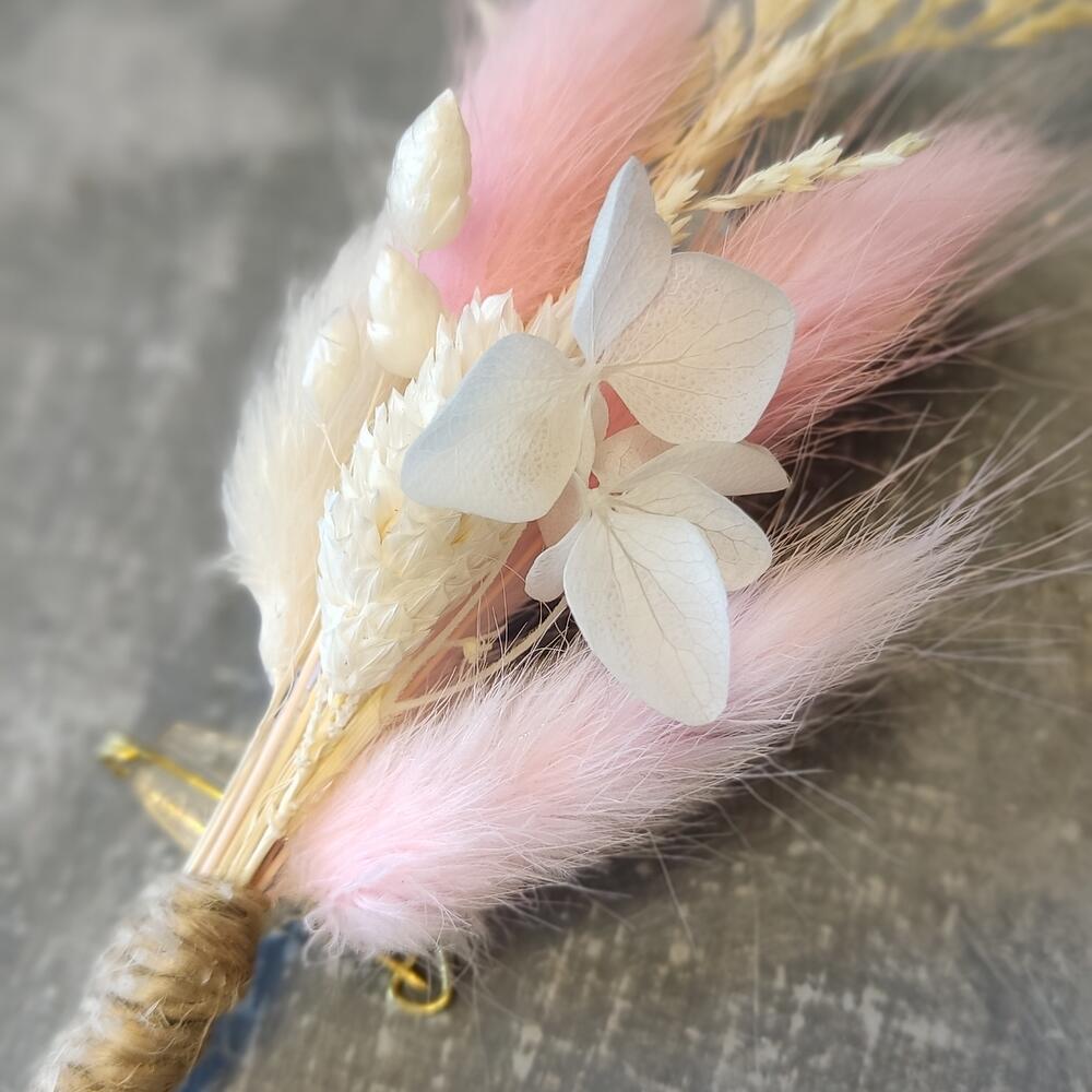 Лагурус – 5 шт.Фаларис – 2 шт.гортензия стабилизированная – 1 шт.Бриза – 1 шт.булавка для бутоньерки – 1 шт.Шпагат джутовый – 1 шт.