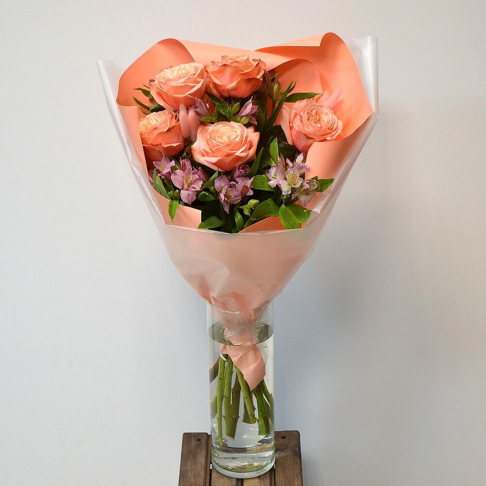 пионовидные розы – 5 шт.Альстромерия – 6 шт.Лагурус – 7 шт.стильная упаковка букета – 1 шт.