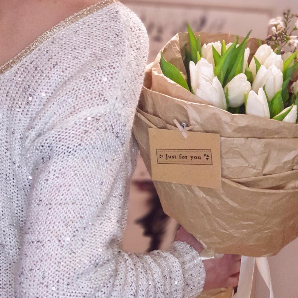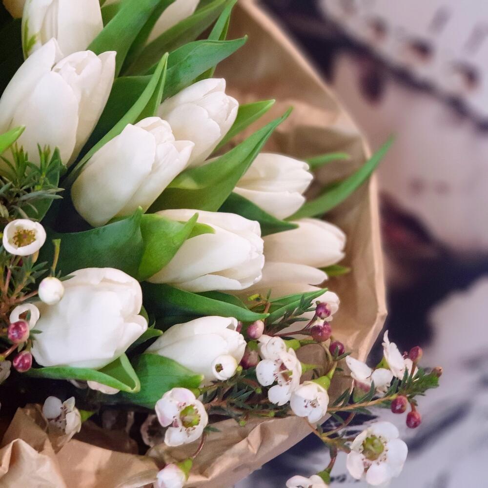 Лента атласная – 1 шт.Открыточка с вашими пожеланиями – 1 шт.Ваксфлауэр белый – 2 шт.тюльпаны белые – 15 шт.любовь флориста (бесплатно) – 1 шт.крафт жатая бумага – 1 шт.