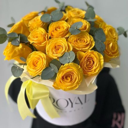 Съедобный букет из фруктов, винограда, конфет, кустовых роз, ягод и орхидей в дизайнерской коробке “Тропический вальс”