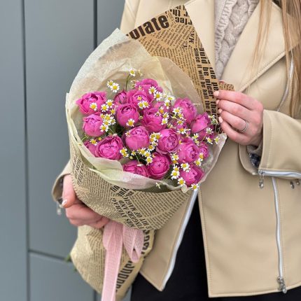Пышный нежный и ароматный букет “Рассвет в любви” с розами, эвкалиптом, лизиантусом и генистой