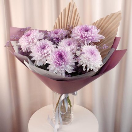 Хризантемы и Пионовидные кустовые розы в коробке + открытка ручной работы в подарок